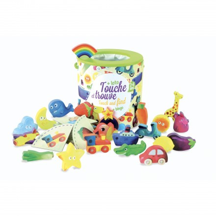 Dentro del cubo hay 40 piezas de madera. Deberemos meter la mano y dentro y por el tacto encontrar las piezas que tengamos en el cartón. Divertida lotería táctil, permite el juego libre con las piezas de madera. A partir de 2 años.