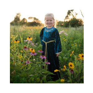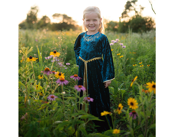 Prepárate para aventuras mágicas con este impresionante atuendo de princesa medieval. Tu pequeña aventurera adorará ser su propia heroína de cuento de hadas en este vestido de terciopelo de cuerpo entero diseñado en llamativo turquesa oscuro con exquisitos detalles dorados y bordados. Talla: 5-6 años.