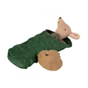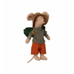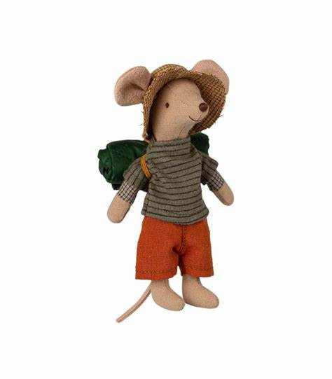 Este ratón está bien preparado para un viaje de senderismo en la naturaleza salvaje. Está vestido para muchos días de camino y trae su bolsa de dormir para noches bajo las estrellas. Lleva imanes en sus manos.