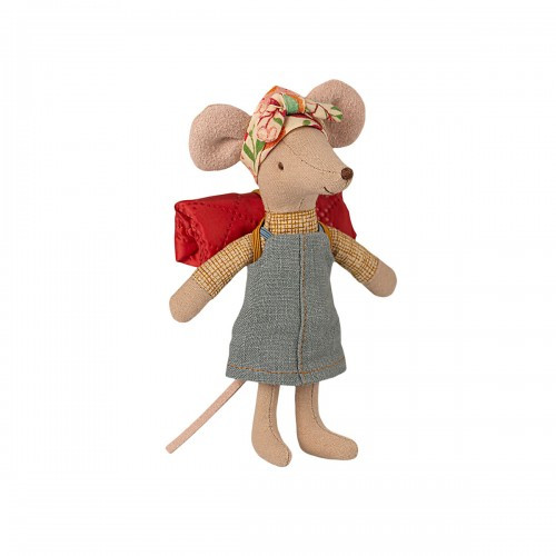 Esta ratona está bien preparada para un viaje de senderismo en la naturaleza salvaje. Está vestida para muchos días de camino y trae su bolsa de dormir para noches bajo las estrellas. Lleva imanes en sus manos.