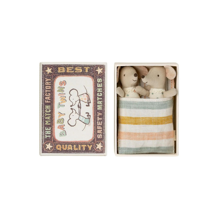 Ratoncitos Gemelos en caja de cerillas de cartón y con preciosa ropa de cama.