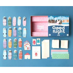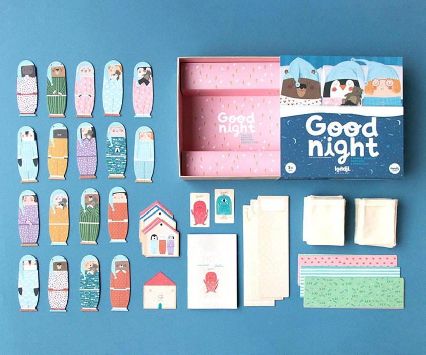 Nuestros amigos soñadores se van a dormir. ¿Quién lleva el pijama igual? ¿Quién duerme en mi casa? ¿Dónde está el monstruo de debajo de la cama? ¡Buenas noches! Un juego familiar con el que se puede jugar de tres formas distintas: · Juego de memoria Con todos los personajes dentro de sus camas, es necesario encontrar a los personajes que visten el mismo pijama. · Las familias Usando las cartas con forma de casa, el objetivo para cada jugador es encontrar todos los miembros de una familia en un solo turno. · El monstruo de debajo de la cama El objetivo es descubrir dónde se esconde el monstruo de debajo de la cama. En este juego necesitamos un jugador director, que será el encargado de esconder un monstruo y responder con "si" o "no" las preguntas del resto de jugadores, como por ejemplo: " El monstruo de debajo de la cama está en la cama ¿de un pingüino?". Un bonito juego de mesa para los más pequeños de la familia con 3 modalidades de juego: memoria, relación y deducción. Un juego sostenible hecho con mucho detalle. A partir de 3 años.