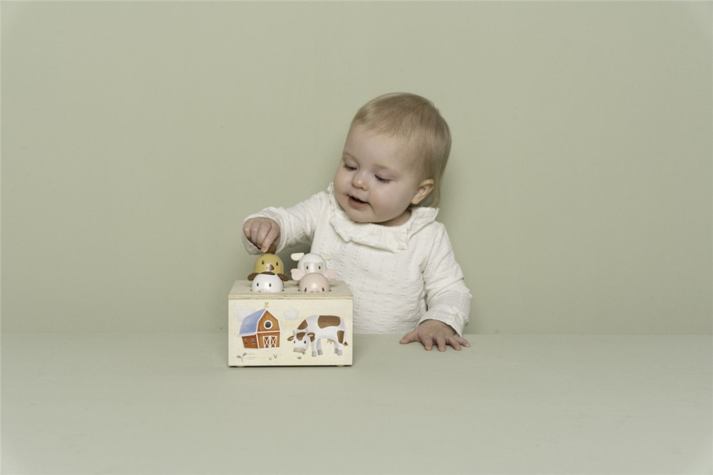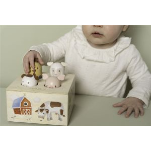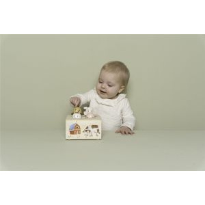 ¿Qué pasa, pequeño granjero? Estos cuatro animales de granja están listos para jugar al escondite, Con un suave empujón, un animal entra y el otro sale haciendo cada uno su sonido correspondiente. Con este sencillo juego los más pequeños se divertirán empujando y escondiendo los animales, además de aprender a reconocerlos. Fomenta la coordinación ojo-mano. A partir de 12 meses.