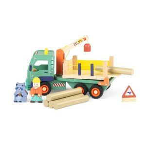 A partir de 3 años. Camión con garga y personaje. Contiene una pequeña grua con iman y troncos magnéticos.además del personaje, tejón y señal de tráfico. Material: madera de haya