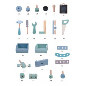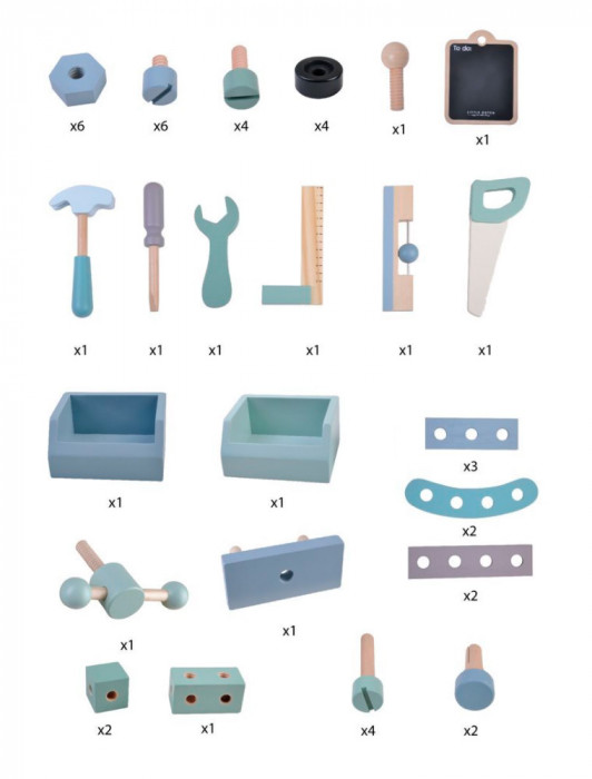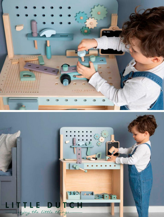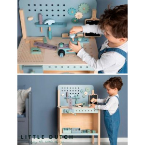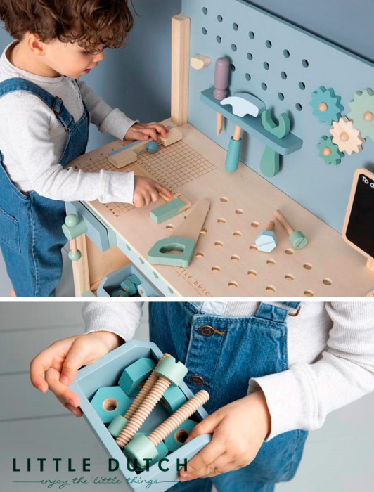 Este robusto banco de trabajo de madera de Little Dutch viene con herramientas de madera y muchas cosas para montar, tocar y golpear. El conjunto completo consta de 48 partes, que incluyen un martillo, una llave, un destornillador, tuercas y pernos. Mantenga todas sus herramientas a mano con el práctico y ajustable cinturón de herramientas.